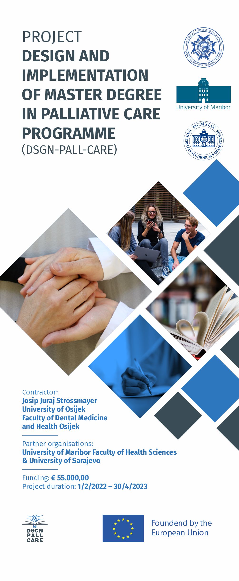 Under the leadership of Prof. Aleksandar Včev, Ph.D., Dean of the Faculty of Dental Medicine and Health Osijek, an initiative was launched in collaboration with the University of Maribor, Faculty of Health Sciences, and the University of Sarajevo to develop an English-language graduate programme in palliative care. The collaboration was also contracted with TERA Tehnopolis d.o.o., a member of the Josip Jurja Strossmayer University in Osijek, as technical support for the preparation and implementation of the project.