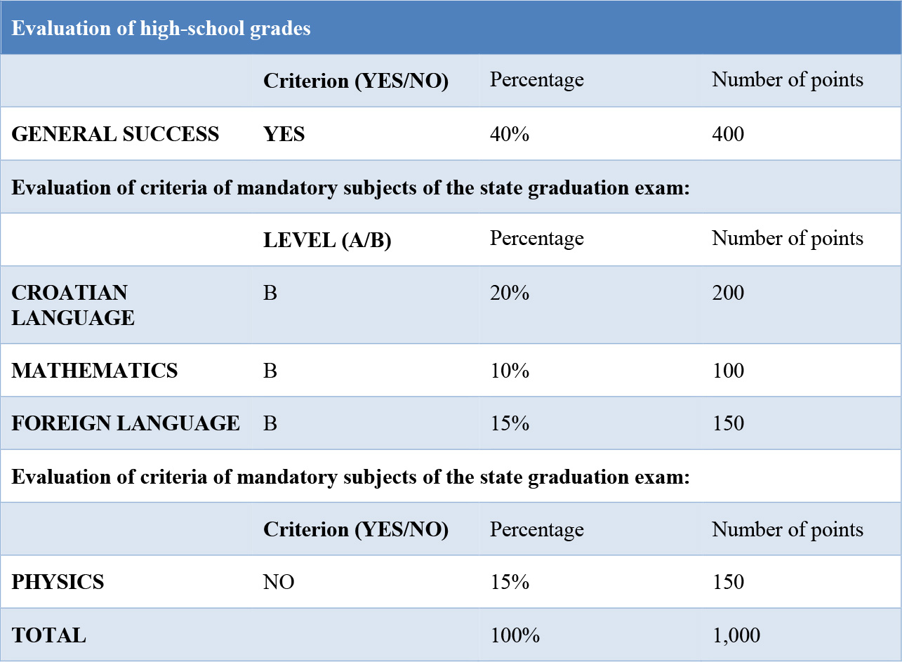1. Completed a four-year high school and passed a state graduation exam in Republic of Croatia – selection of candidates according to the unified list of the Central Applications Office. We propose the following points system for enrolment in this study programme: