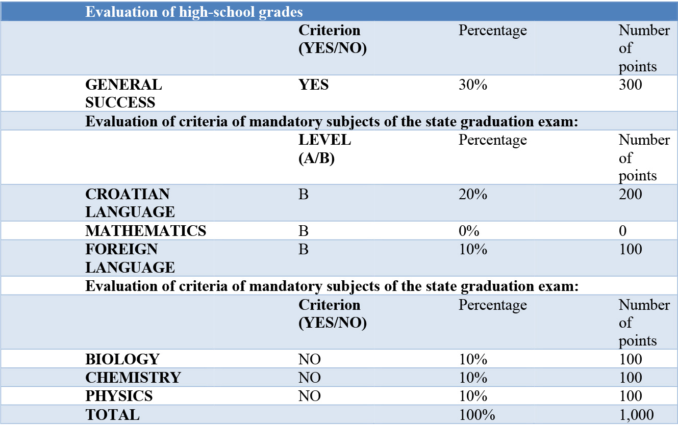 1. Completed a four-year high school and passed a state graduation exam in Republic of Croatia – selection of candidates according to the unified list of the Central Applications Office, and according to the criteria for evaluating the results of the state graduation exam adopted by the Faculty.