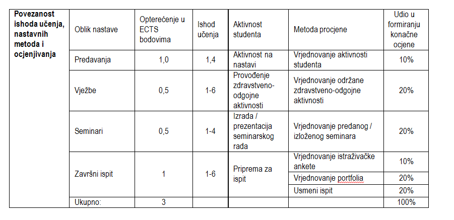 Osposobiti studente za utvrđivanje zdravstveno-odgojnih potreba pojedinca i skupina, planiranje zdravstveno-odgojnih aktivnosti, provođenje programa zdravstvenog odgoja, pomoć pojedincima i skupinama u korištenju vlastitih resursa za zdravlje. Osposobiti studente za provođenje aktivnosti usmjerenih unapređenju zdravlja.
