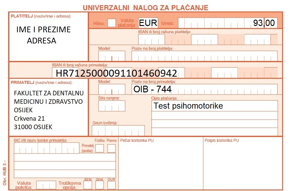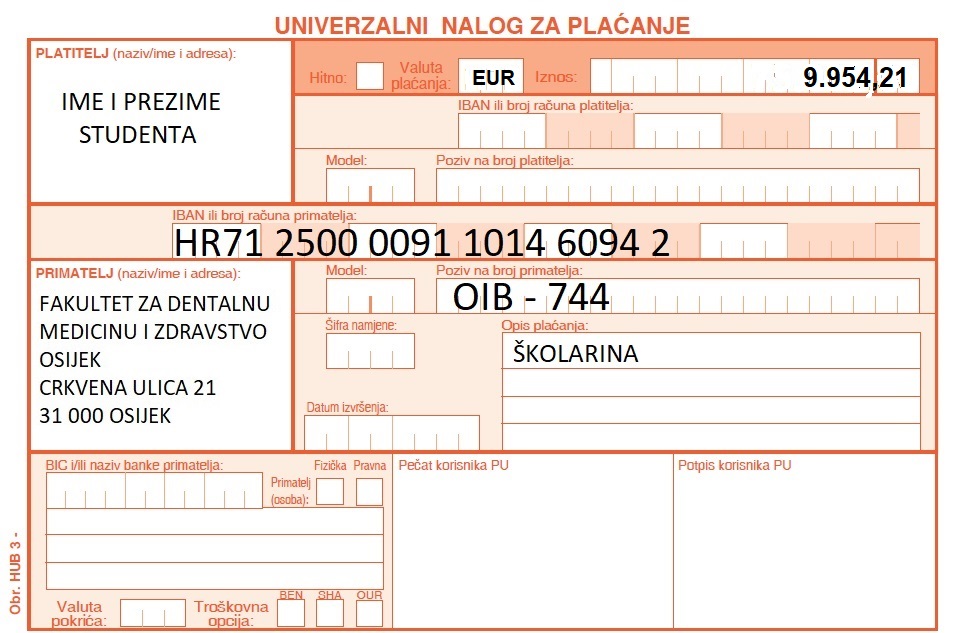 Molim Vas da gore navedene troškove uplatite na IBAN HR7125000091101460942, Fakulteta za dentalnu medicinu i zdravstvo Osijek. Obavezno upišite svoj OIB (ispod broja žiro računa, na mjesto poziv na broj) - 744.