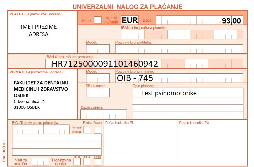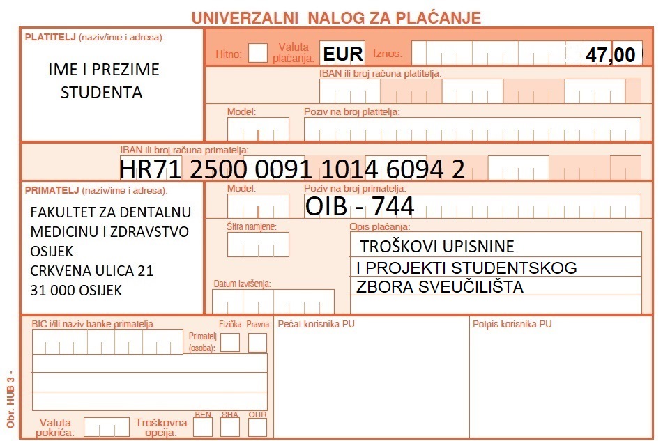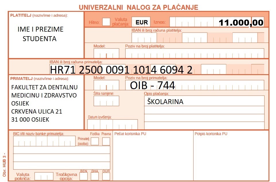 Molim Vas da gore navedene troškove uplatite na IBAN HR7125000091101460942, Fakulteta za dentalnu medicinu i zdravstvo Osijek. Obavezno upišite svoj OIB (ispod broja žiro računa, na mjesto poziv na broj) - 744.