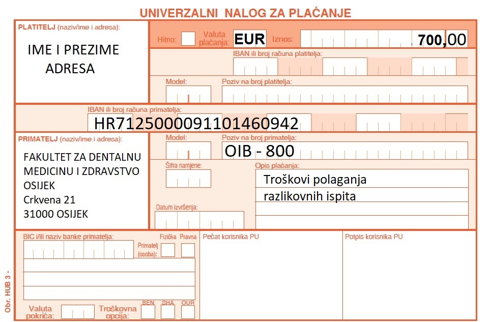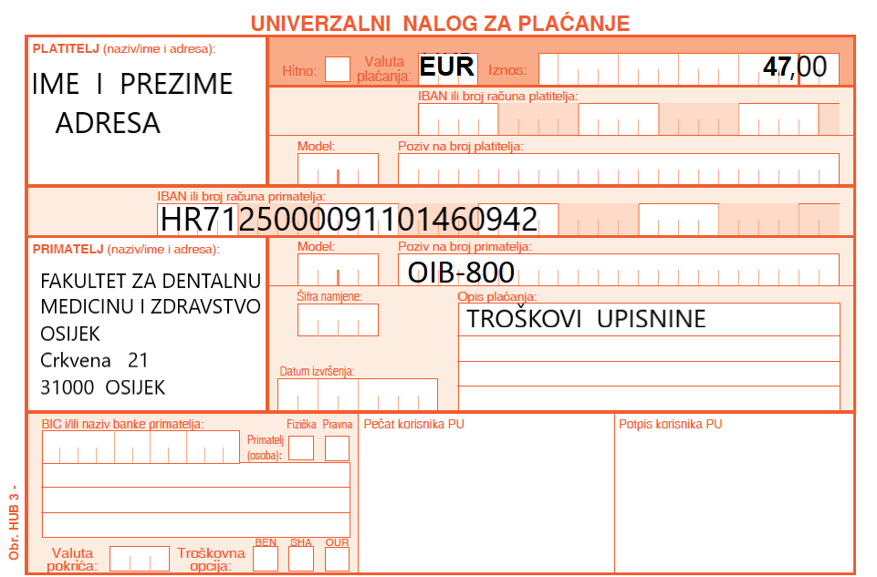 2.) Dvije uplatnice: - Uplatnicu na žiro IBAN HR7125000091101460942, poziv na broj: OIB-800, iznos od 47,00 eura za troškove upisa - primjer uplatnice (.jpg), i uplatnicu na žiro IBAN HR7125000091101460942, poziv na broj: OIB-800, iznos od 2.000,00 eura za troškove školarine za akademsku 2025./2026. godinu - primjer uplatnice (.jpg)