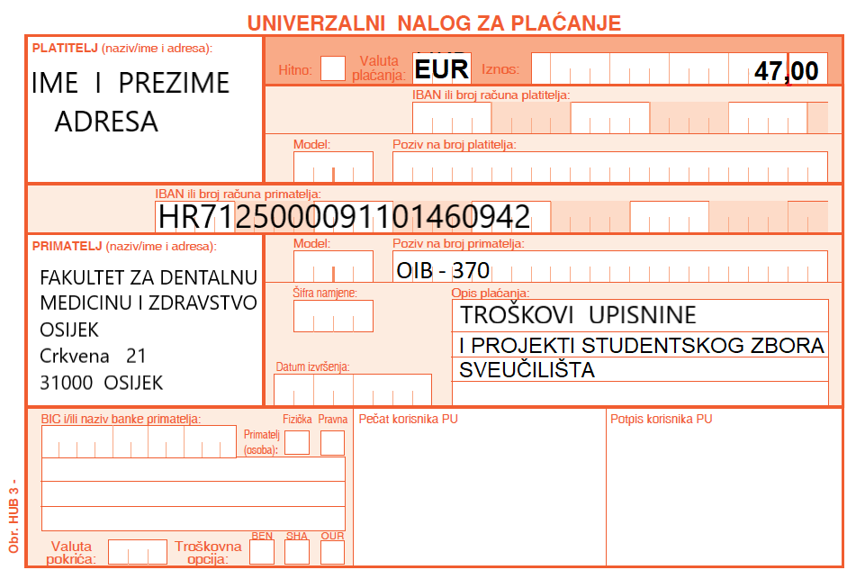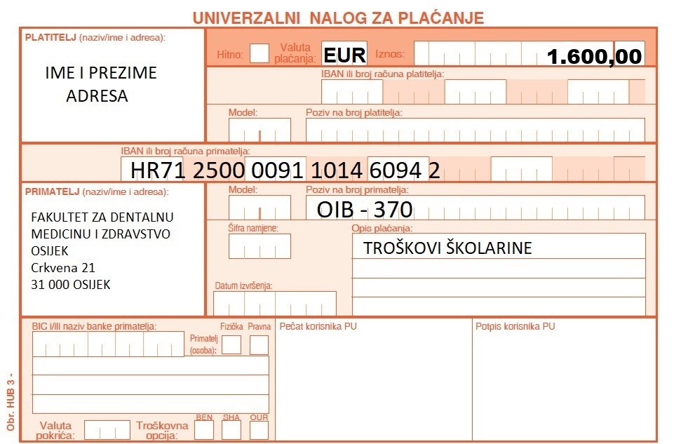 Molim Vas da gore navedene troškove uplatite na IBAN HR7125000091101460942, Fakulteta za dentalnu medicinu i zdravstvo Osijek. Obavezno upišite svoj OIB (ispod broja žiro računa, na mjesto poziv na broj) - 370.