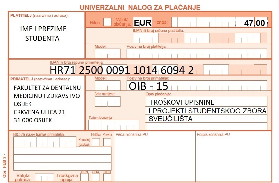 Molim Vas da gore navedene troškove uplatite na IBAN HR7125000091101460942, Fakulteta za dentalnu medicinu i zdravstvo Osijek. Obavezno upišite svoj OIB (ispod broja žiro računa, na mjesto poziv na broj) - 15.