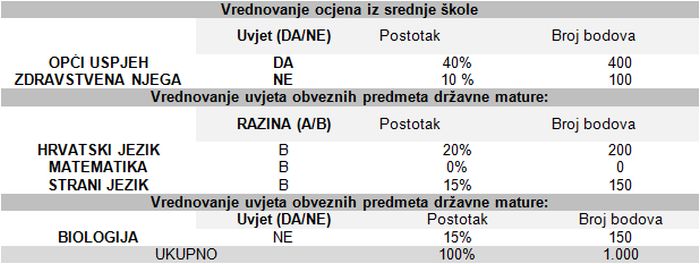 1. Završenu četverogodišnju srednju školu i položenu državnu maturu u Republici Hrvatskoj – odabir kandidata prema jedinstvenoj listi Središnjeg prijavnog ureda, a prema parametrima vrjednovanja rezultata državne mature koje donosi Fakultet. Aktualni sustav bodovanja za upis na ovaj studijski programa je: