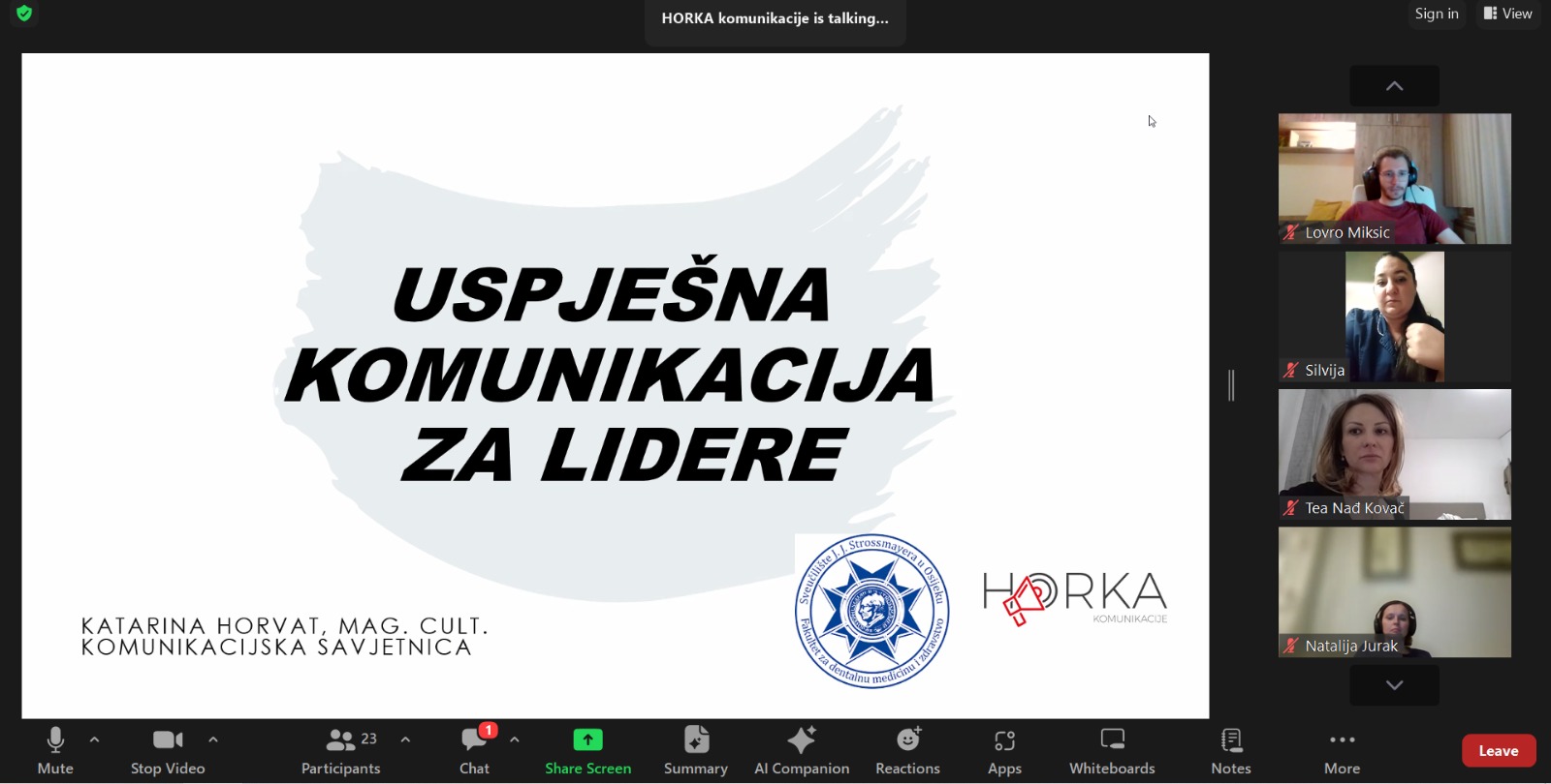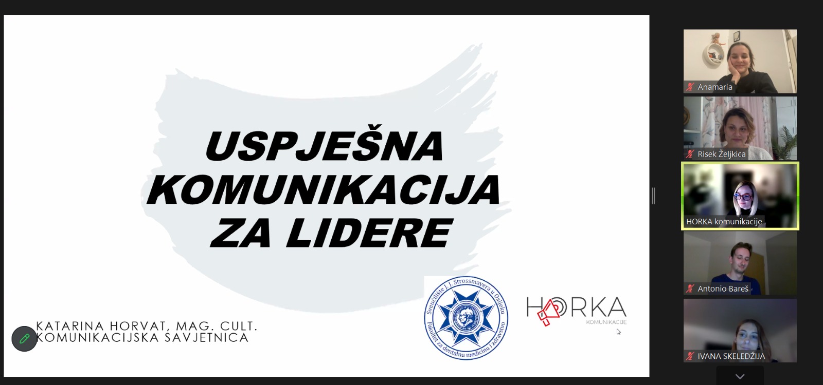 U utorak 26.3.2024. je završena edukacija „Uspješna komunikacija za lidere“ koju su organizirali Studentski Zbor FDMZ-a Osijek, FDMZ Osijek i HORKA komunikacije.  Edukaciju je uspješno vodila Katarina Horvat, mag. cult. Edukacija je održana kroz 11 tjedna online putem preko Zoom platforme, a polaznici su tijekom edukacije učili kako uspješno komunicirati kao lideri.