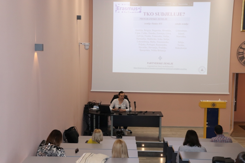 Josipa Pleša, stručna suradnica za Erasmus+ mobilnost Sveučilišta J. J. Strossmayera u Osijeku, educirala je sve zainteresirane studente o postupku prijave na Natječaj za ostvarivanje mobilnosti. Demonstrirala je potrebne obrasce te ukazala studentima na popis inozemnih učilišta na kojima mogu ostvariti mobilnost. Pozvala je studente koji imaju nedoumica da, nakon proučavanja objavljenih uputa i obrazaca, kontaktiraju Erasmus+ koordinatore Fakulteta, a po potrebi i Sveučilišta, kako bi se u što kraćem roku saznale sve potrebne informacije te uspješno ostvarila mobilnost. U zaključku, naglasila je kako je u tijeku natječaj za studentsku mobilnost za ljetni semestar te je pozvala studente Fakulteta da sudjeluju u ovom nezaboravnom i nezamjenjivom iskustvu.