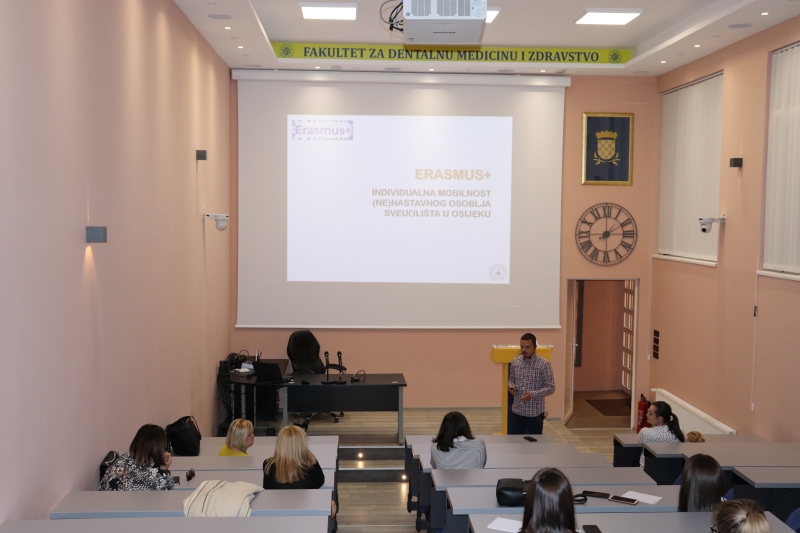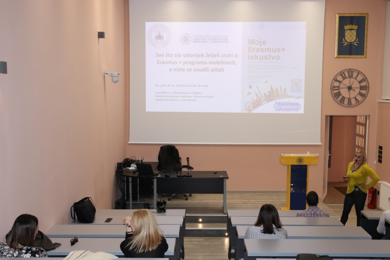 Izv. prof. dr. sc. Martina Smolić, akademska Erasmus+ koordinatorica Fakulteta za dentalnu medicinu i zdravstvo Osijek, održala je predavanje u kojemu je naglasila prednosti sudjelovanja u međunarodnim razmjenama, kako za studente, tako i za nastavno i nenastavno osoblje Fakulteta. Podijelila je svoja osobna iskustva sudjelovanja u mobilnostima koja su u velikoj mjeri utjecala na njezin kasniji znanstveni i stručni rad. Pozvala je sve zainteresirane studente i osoblje da joj se obrate sa svim nedoumicama te se odluče na korištenje ove jedinstvene mogućnosti koja im se pruža kroz Erasmus+ program, kako bi uz financijsku potporu stekli iskustvo studiranja, stručne prakse ili rada u inozemstvu.