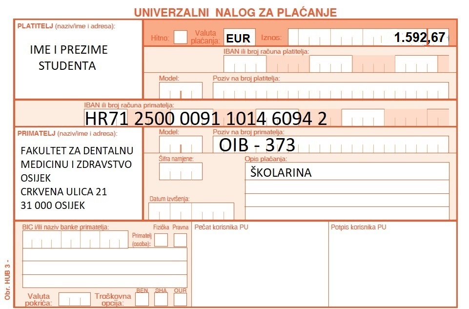 Troškovi upisa uplaćuju se na žiro račun broj: IBAN HR71 2500 0091 1014 6094 2. Ukoliko je student u akademskoj godini stekao manje od 24 ECTS boda – može upisati godinu u statusu izvanrednog studenta.